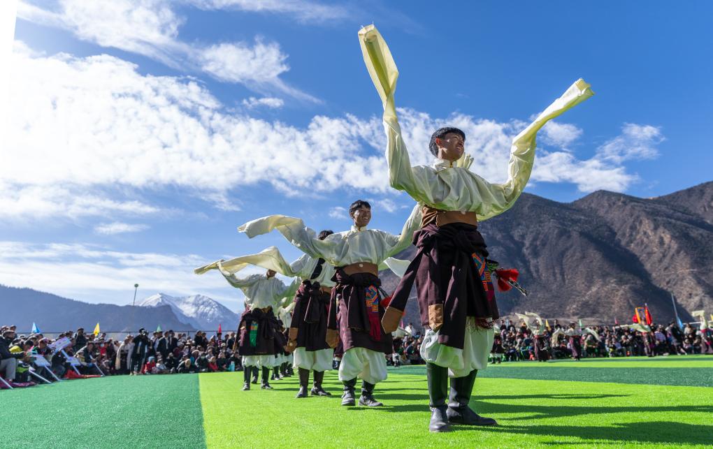 在馬利鎮(zhèn)“云中球場”,當(dāng)?shù)厝罕娫谇蛸愰_幕式上表演舞蹈(1月2日攝)。新華社記者 丁增尼達(dá) 攝