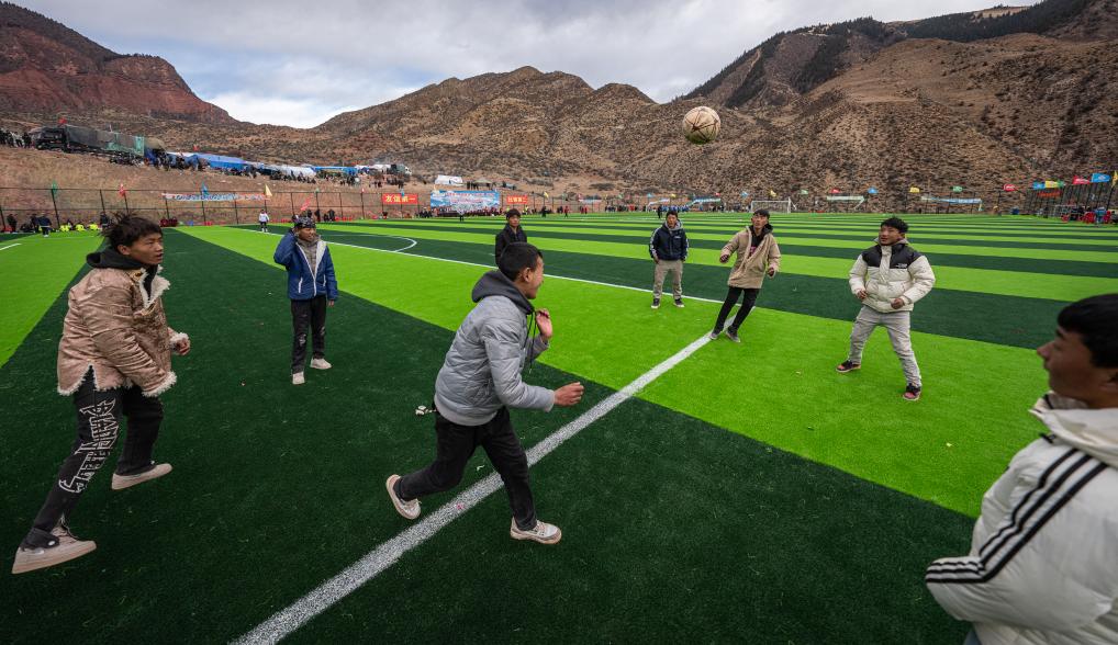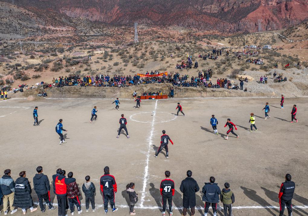 在馬利鎮(zhèn)“云中球場”,幾名球迷趁著球賽間隙踢球玩耍(1月2日攝)。新華社記者 丁增尼達(dá) 攝