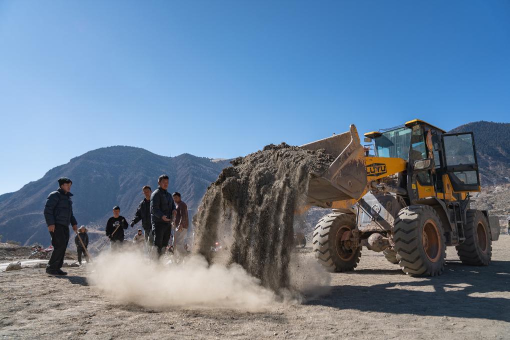 在馬利村的足球場上,球員嘎瑪加永燈培的爸爸用裝載機(jī)平整地面(2024年1月20日攝)。新華社記者 丁增尼達(dá) 攝