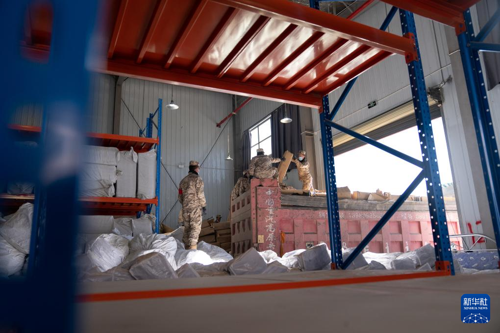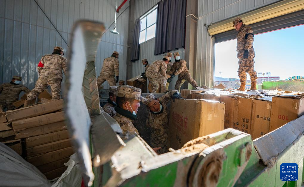 1月8日,在日喀則市經(jīng)開區(qū)物資儲備倉庫,武警官兵在搬運抗震救災(zāi)物資。新華社記者 丁增尼達 攝