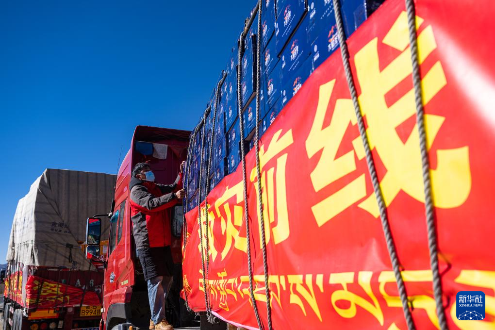 1月8日,在日喀則市境內(nèi)的318國道旁,當?shù)仄髽I(yè)工作人員在用繩子固定抗震救災(zāi)物資。新華社記者 丁增尼達 攝