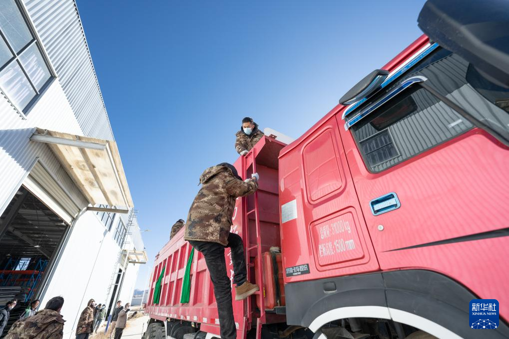 1月8日,在日喀則市經(jīng)開區(qū)物資儲備倉庫,裝好抗震救災(zāi)物資的車輛駛出園區(qū)。新華社記者 丁增尼達 攝