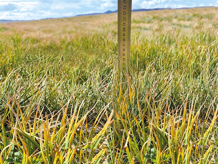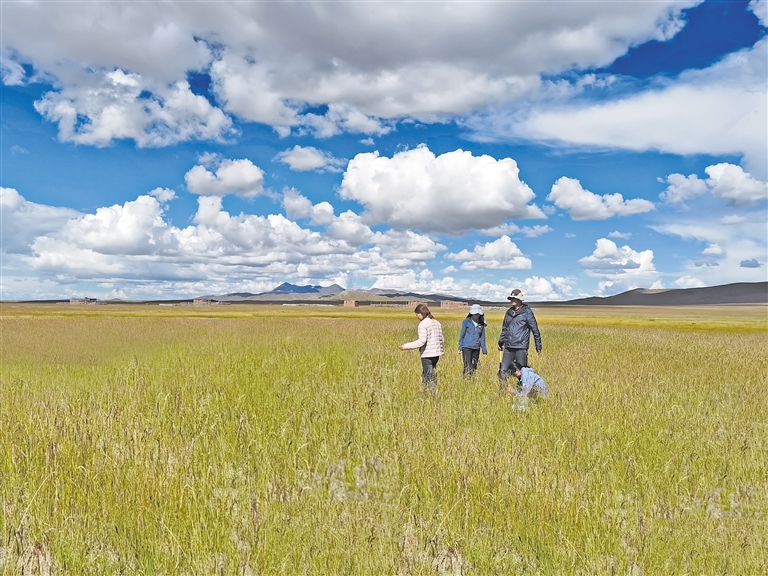 科研人員視察那曲市色尼區(qū)那么切鄉(xiāng)生態(tài)修復(fù)點(diǎn)牧草長勢(shì)情況。