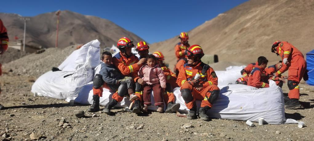 1月8日,在定日縣措果鄉(xiāng)野江村,孩子們和消防救援人員一起做游戲。新華社記者 魏冠宇 攝