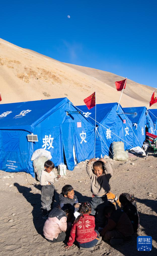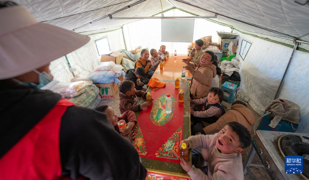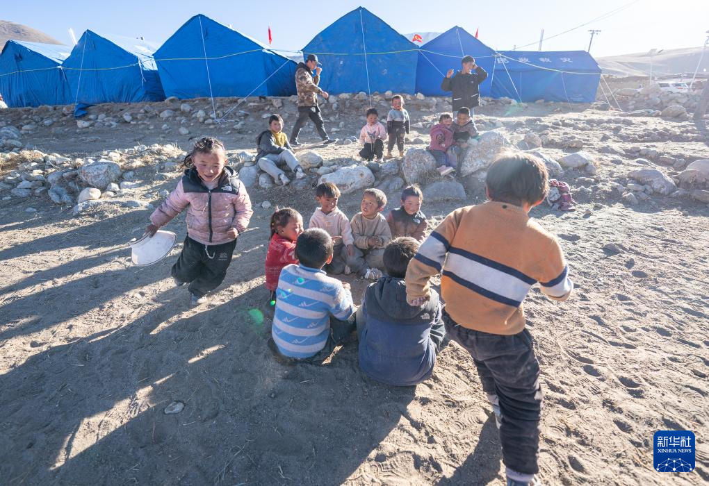 1月10日,在定結(jié)縣郭加鄉(xiāng)乃村安置點(diǎn),孩子們在學(xué)生臨時(shí)學(xué)習(xí)區(qū)做游戲。新華社記者 丁增尼達(dá) 攝