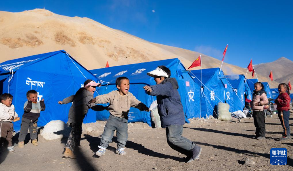 1月10日,孩子們在定結(jié)縣郭加鄉(xiāng)切村安置點(diǎn)玩耍。新華社記者 丁增尼達(dá) 攝