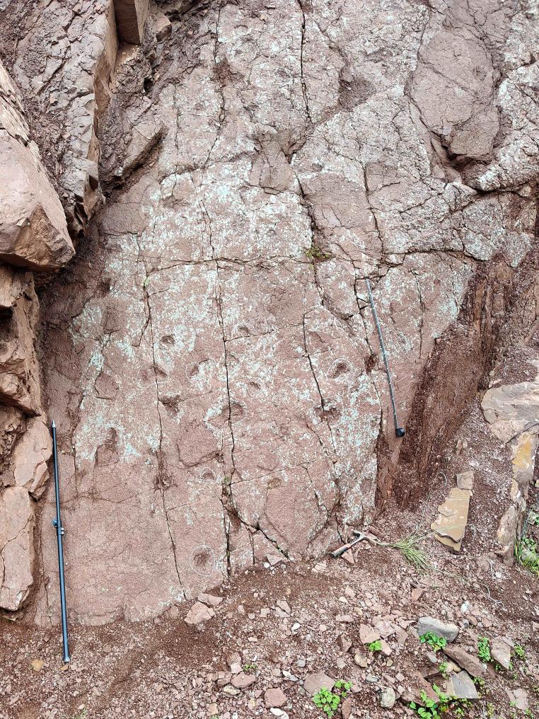 恐龍研究專家、中國(guó)地質(zhì)大學(xué)(北京)副教授邢立達(dá)介紹,昌都所在的侏羅紀(jì)地層最大厚度超4800米,產(chǎn)出了大量恐龍足跡化石。2023年7月,中國(guó)地質(zhì)調(diào)查局相關(guān)人員在此開(kāi)展化石遺跡調(diào)查時(shí),意外發(fā)現(xiàn)疑似爬行動(dòng)物腳印的巖石石壁,后與中國(guó)地質(zhì)大學(xué)(北京)展開(kāi)合作。