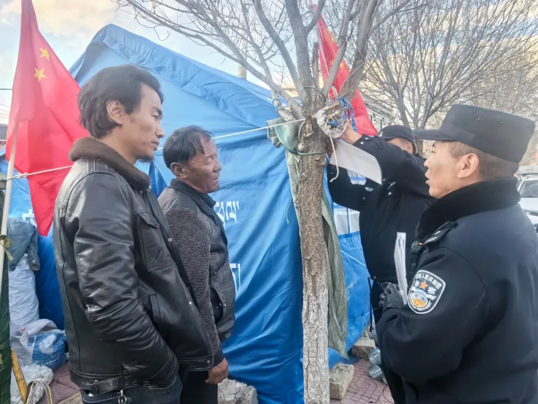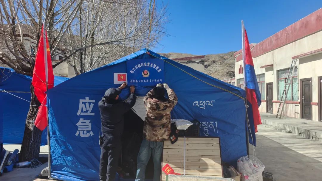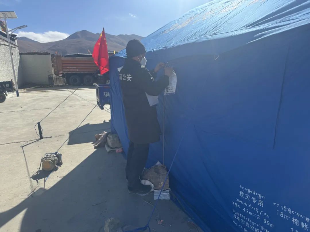 災情如令,責任重于泰山。在這場爭分奪秒與時間賽跑的抗震救災戰(zhàn)斗中,拉孜公安始終堅定地與群眾并肩同行,以“伴隨式”守護的帳篷警務室,為受災群眾筑牢安全防線。一頂頂 “帳篷警務室” 以迅雷不及掩耳之勢搭建完成,恰似一座座堅固的堡壘;一面面鮮艷的黨旗在廢墟之上獵獵作響,傲然飄揚,它們共同構(gòu)成了守護受災群眾生命財產(chǎn)安全的鋼鐵長城,成為抗震救災戰(zhàn)場上一道令人動容的亮麗風景線 。