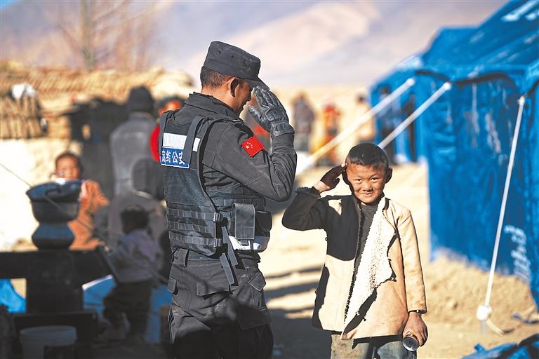 “照片上的這位民警是我們的同事,叫普次仁。1月9日,他在村里的臨時(shí)安置點(diǎn)巡邏的時(shí)候,看到一個(gè)小男孩,便將自己手中的飲料遞給他。沒想到這個(gè)叫達(dá)瓦扎西的小男孩很認(rèn)真地給他敬了個(gè)禮?!倍ńY(jié)縣公安局應(yīng)急救援小分隊(duì)隊(duì)員高靜說(shuō),“照片是我在定日縣措果鄉(xiāng)吉翁村拍的。”