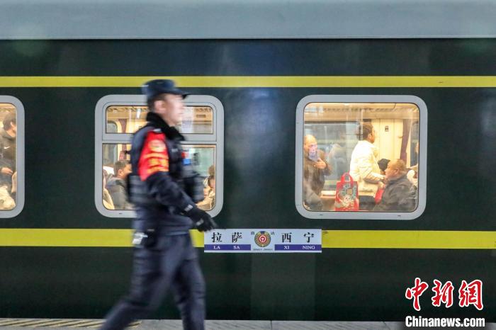 春運首日,拉薩站派出所民警在站臺巡視。 黃飛 攝