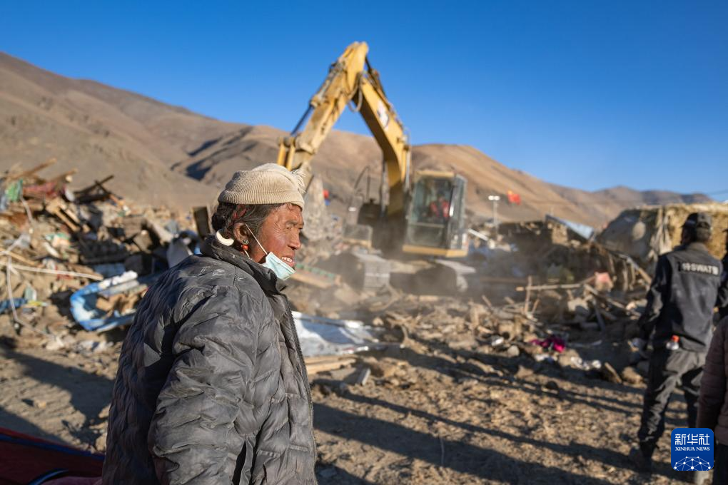 1月13日,在定日縣長(zhǎng)所鄉(xiāng)古榮村,次仁扎西老人站在自家的廢墟前。新華社記者 丁增尼達(dá) 攝