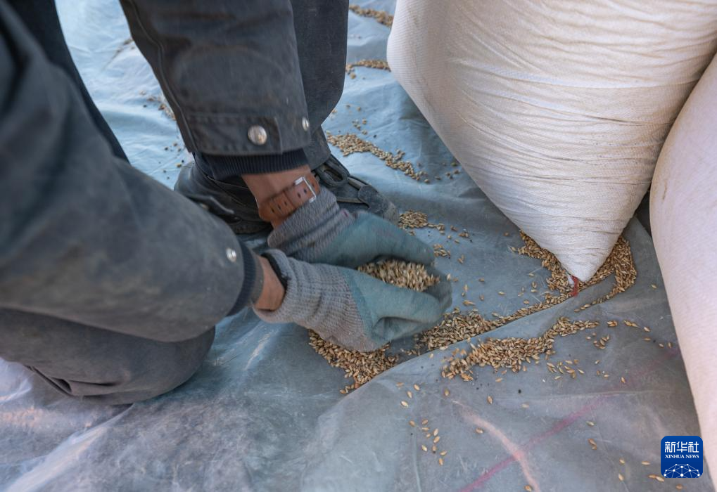 1月13日,在定日縣長(zhǎng)所鄉(xiāng)古榮村,次仁扎西老人在整理搶救出來的青稞。新華社記者 丁增尼達(dá) 攝