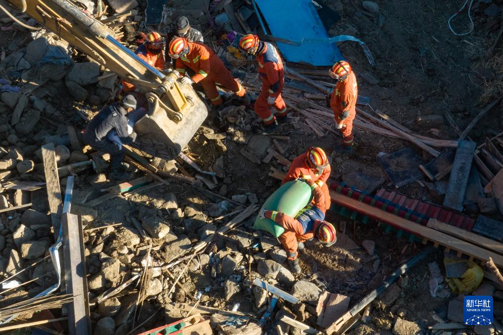 1月13日,在定日縣長(zhǎng)所鄉(xiāng)古榮村,消防員、武警官兵和公安干警在搜尋次仁扎西老人家里的青稞。新華社記者 丁增尼達(dá) 攝