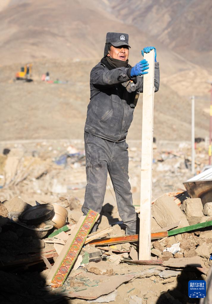 1月13日,在定日縣長(zhǎng)所鄉(xiāng)古榮村,參與廢墟清理的公安干警捧起撒在地上的青稞。新華社記者 丁增尼達(dá) 攝