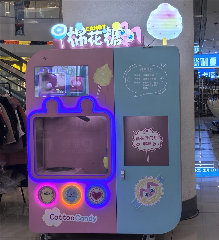除了自助游戲機(jī),自助棉花糖機(jī)也是一大亮點(diǎn)。在拉薩市多家大型商超內(nèi),自助棉花糖機(jī)成為了孩子們的新寵。記者走訪發(fā)現(xiàn),目前拉薩各大商場內(nèi)的棉花糖機(jī)大多為同一品牌,機(jī)子中的棉花糖有42種,一個棉花糖售價19.9元。市民可以根據(jù)口味、顏色、造型選擇棉花糖,操作流程也十分便捷,選購后掃碼支付即可。