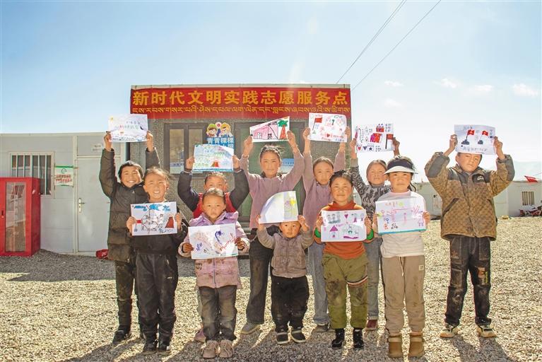圖為定日縣長(zhǎng)所鄉(xiāng)嘎旦村的孩子們展示自己畫。記者 馬曉艷 旦增嘎瓦 攝