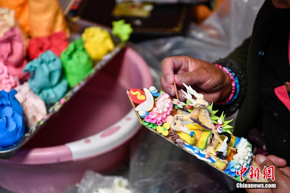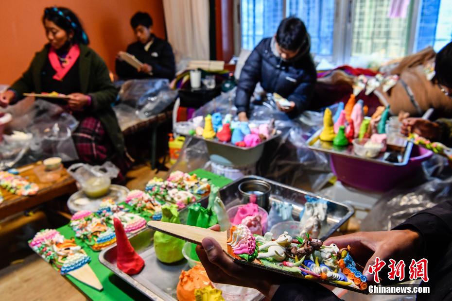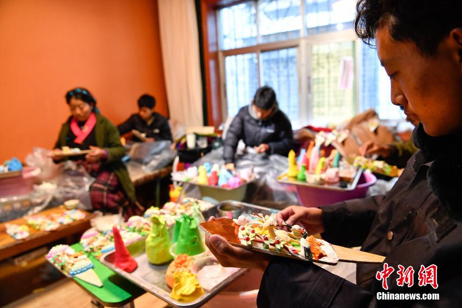 2月15日,手工藝人在拉薩制作酥油花。隨著藏歷新年臨近,酥油花在拉薩年貨市場(chǎng)上熱銷。酥油花在藏語(yǔ)中稱為“孜扎”,是藏族民眾家庭中必備的年貨之一。中新社記者 貢嘎來(lái)松 攝