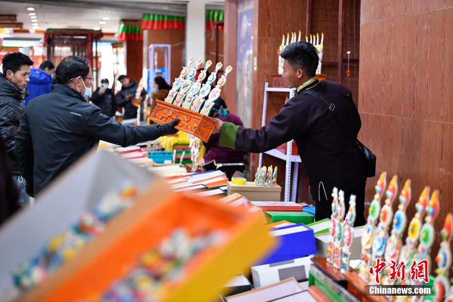 2月15日,拉薩市民在八廓商城選購(gòu)年貨酥油花。隨著藏歷新年臨近,酥油花在拉薩年貨市場(chǎng)上熱銷。酥油花在藏語(yǔ)中稱為“孜扎”,是藏族民眾家庭中必備的年貨之一。