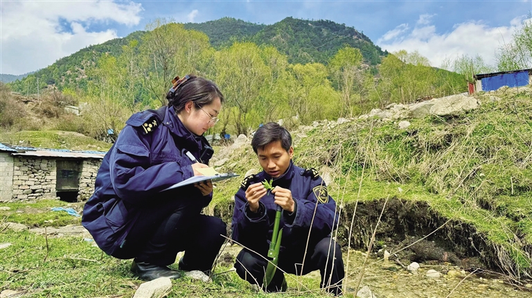 拉薩海關(guān)所屬吉隆海關(guān)關(guān)員開展國(guó)門生物安全監(jiān)測(cè)。圖由拉薩海關(guān)提供