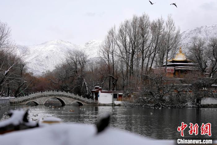 2月19日,西藏拉薩經(jīng)過持續(xù)降雪,城市四周白雪皚皚。雪山、建筑相映成景、風光秀麗。圖為2月19日,雪后宗角祿康公園。中新社記者 李林 攝