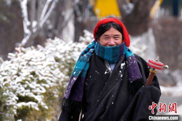 2月19日,西藏拉薩經(jīng)過持續(xù)降雪,城市四周白雪皚皚。雪山、建筑相映成景、風光秀麗。圖為2月19日,信眾在雪后的宗角祿康公園轉經(jīng)。中新社記者 李林 攝