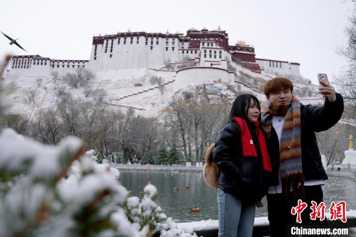 2月19日,西藏拉薩經(jīng)過持續(xù)降雪,城市四周白雪皚皚。雪山、建筑相映成景、風光秀麗。圖為2月19日,游客在布達拉宮腳下的宗角祿康公園拍照留念。中新社記者 李林 攝