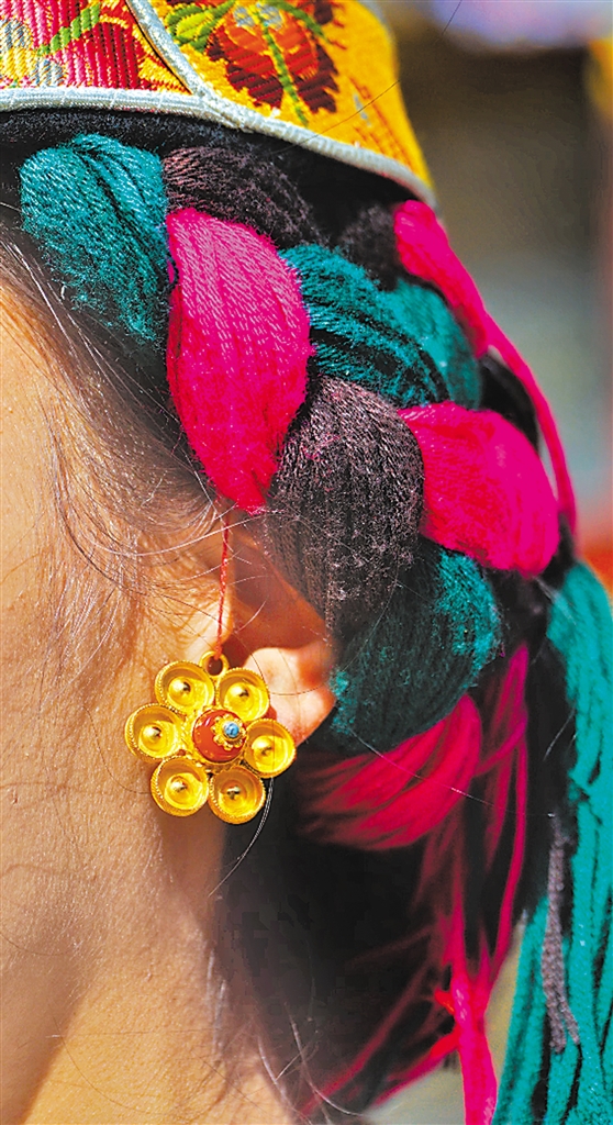 女士們的服飾則更加絢麗多彩。她們大多穿著黑色氆氌藏袍,系著彩虹條紋的圍裙“邦典”,既顯得端莊得體,又不失女性柔美。她們佩戴的耳環(huán)、項(xiàng)鏈、手鐲、戒指等飾物雖然簡(jiǎn)單,但卻淡雅樸素,與高原的自然風(fēng)光相得益彰。特別值得一提的是,墨竹工卡縣的女性喜愛(ài)佩戴花朵形耳飾,與她們所戴的帽子“朗霞”形成了完美的搭配。