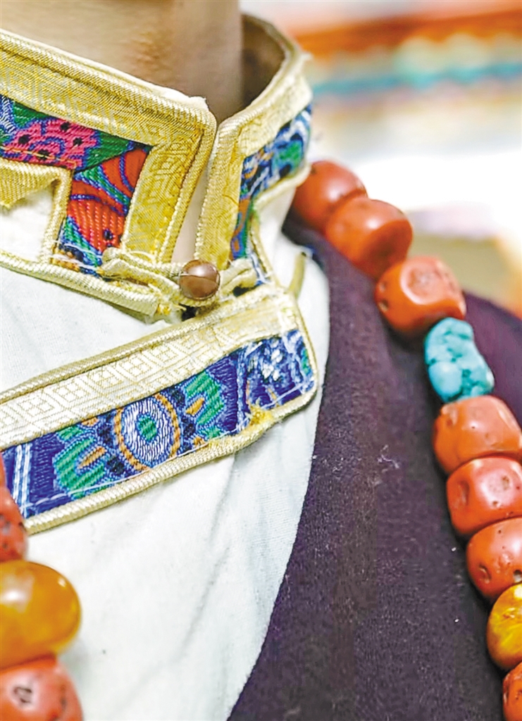 男士們大多身著用家織氆氌制作的藏袍,以黑、白色為主,領(lǐng)口、袖口、下擺等位置鑲嵌著精美的“十”字紋花邊。他們頭戴金花帽,腳穿“松巴”鞋,整個(gè)裝扮既展現(xiàn)了高原男子的粗獷與豪放,又透露出一種對(duì)細(xì)節(jié)的極致追求。女士們的服飾則更加豐富多彩,她們穿著黑色氆氌藏袍,內(nèi)搭彩色襯衫,系著彩虹條紋的“邦典”,已婚女子還會(huì)將各色絲線(xiàn)編入頭發(fā)中形成發(fā)辮,恰似高原上綻放的花朵。