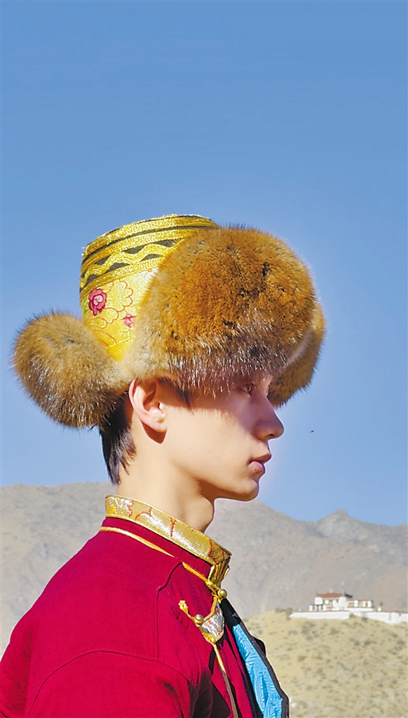 “朗霞”藏語(yǔ)意為氆氌帽,是墨竹工卡縣女性服飾的重要組成部分。這種帽子以黑色氆氌做底,兩側(cè)鑲有花邊,后面翹有兩個(gè)角,實(shí)用又美觀,成為女性展示自身魅力的重要配飾。帽子的裝飾因年齡和身份的不同而有所差異,年輕女孩戴的帽子裝飾較多,花紋圖案豐富,頂上為八瓣花,代表著吉祥八寶(傳統(tǒng)圖案)的數(shù)量;成年女性的帽子則少些花俏,更為沉穩(wěn);老年婦人的帽子則簡(jiǎn)潔大方,透露出歲月的積淀與智慧;而僧尼的帽子則為絳紅色,彰顯著她們的宗教身份與信仰。