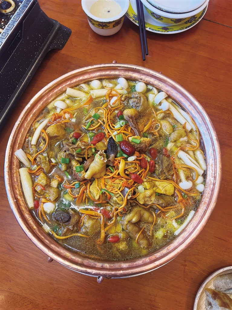 傳統(tǒng)的藏式牦牛肉火鍋講究原汁原味,湯底通常選用牦牛骨熬制數(shù)小時(shí),加入少許鹽和香料即可。鍋底先鋪上一層時(shí)蔬和粉絲,再鋪一層牦牛肉排,最上面是土豆、蘿卜、白菜、青筍、木耳等耐煮的蔬菜,再加上肥瘦相間的新鮮牦牛肉慢慢燉煮。各類(lèi)食材的香味相互碰撞,別提多香了!為了不掩蓋食物本身的香氣,藏式牦牛肉火鍋的蘸料通常比較簡(jiǎn)單,可以用辣椒醬、蔥花、香菜等調(diào)制,也可以根據(jù)個(gè)人喜好加入芝麻醬、腐乳等。牦牛肉火鍋味道濃郁,建議搭配清淡的酥油茶或甜茶等飲品。