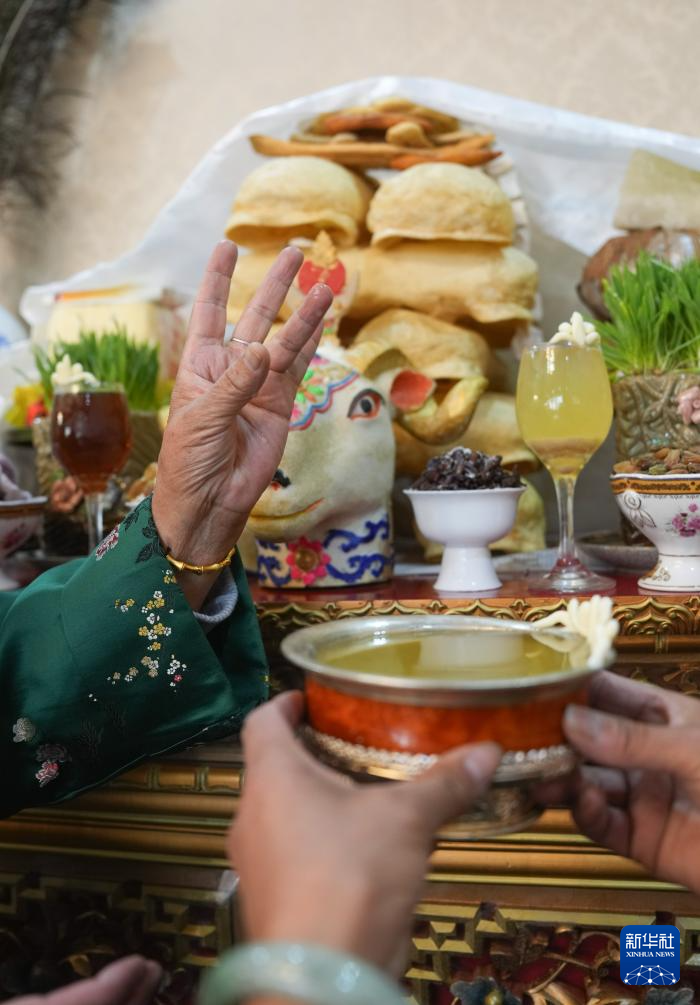 2月28日,身著藏裝的拉薩市民在敬獻(xiàn)青稞酒。