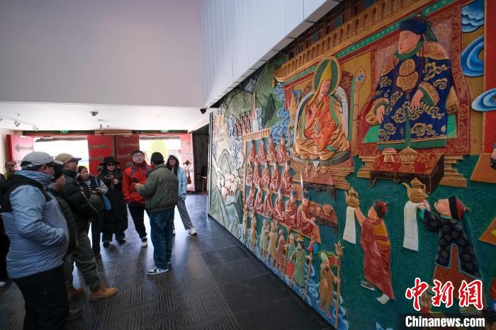 3月18日,游客在布達拉宮珍寶館參觀五世達賴?yán)锏奖本┯P見順治皇帝的浮雕。中新社記者 江飛波 攝