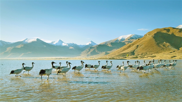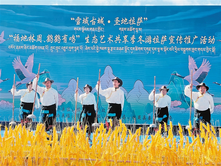 當(dāng)溫暖的陽光輕柔地灑在拉薩河谷,黑頸鶴清脆的鳴叫聲喚醒了林周濕地寧靜的清晨?!案5亓种堋Q鶴有鳴”生態(tài)藝術(shù)共享季之“冬游拉薩”宣傳推廣活動(dòng),以歌舞表演、生態(tài)主旨演講、黑頸鶴攝影作品展、鶴文化專家座談等,融合了生態(tài)、藝術(shù)與文化的盛宴,讓人在雪山、湖泊與鶴影交織的詩意中,感受“冬游拉薩”的獨(dú)特魅力。