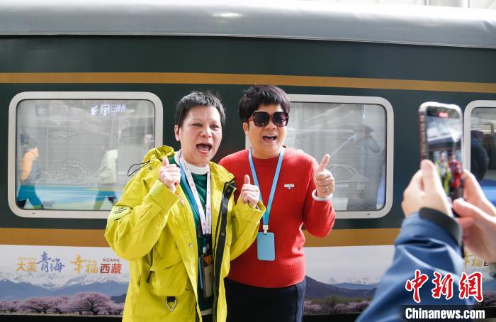 3月26日,乘坐青海首趟直達西藏林芝旅游專列的旅客與列車合影留念。 馬銘言 攝