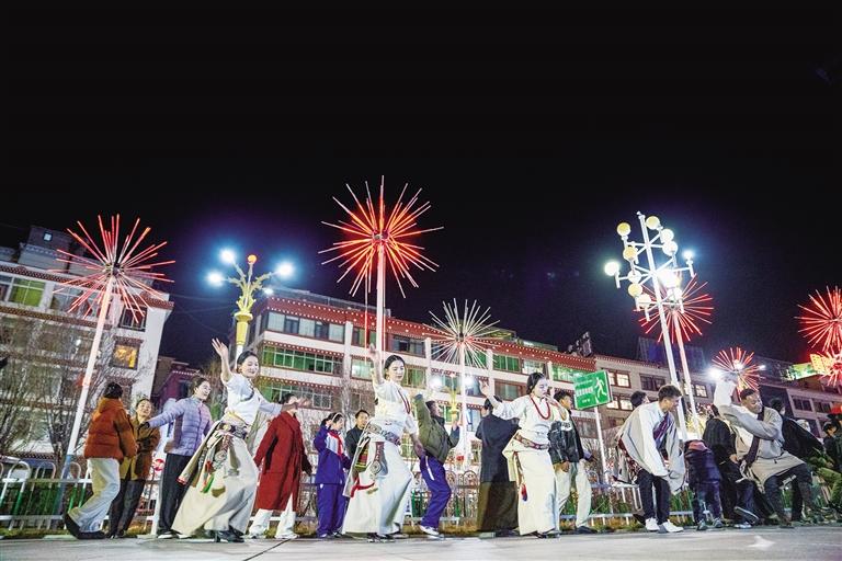 廣場(chǎng)東西橫穿昌都中心城區(qū),全長(zhǎng)約150米,布局錯(cuò)落有致,人流涌動(dòng)。漫步在茶馬廣場(chǎng),兩側(cè)有300余間商鋪,充滿了濃濃的生活氣息。最吸引我們的是廣場(chǎng)一側(cè)的鍋莊舞——男女老少圍成圈,跟著節(jié)奏踢踏轉(zhuǎn)圈,動(dòng)作簡(jiǎn)單卻充滿力量。