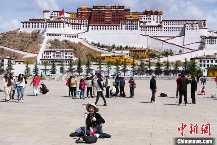 圖為4月18日,一位視頻博主在拉薩布達(dá)拉宮廣場直播,其身后為游客在拍照“打卡”。江飛波 攝