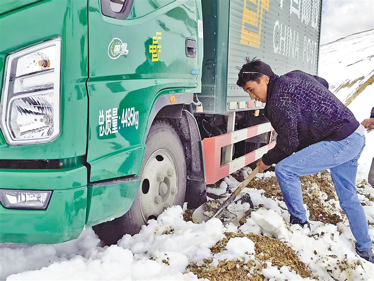 圖為巴桑頓珠在強拉山頂鏟雪,讓郵車脫困(資料照片)。
