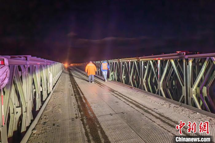 圖為5月12日凌晨地震后,養(yǎng)護(hù)人員對拉孜雅魯藏布江臨時保通鋼架橋進(jìn)行檢查。西藏自治區(qū)交通運輸廳 供圖