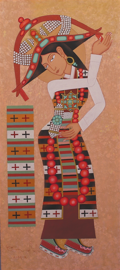在昂桑“傳統(tǒng)當(dāng)隨時(shí)代”的藝術(shù)理念浸潤(rùn)下,徒弟們總能在傳統(tǒng)與當(dāng)代的碰撞中找到獨(dú)特的表達(dá)坐標(biāo):來(lái)自日喀則的藝術(shù)家多吉次旺,早年被昂桑畫(huà)作中藏文元素與抽象色塊的融合所震撼。如今在拉薩創(chuàng)辦工作室的他,正將藏文書(shū)法的中鋒筆觸解構(gòu)為流動(dòng)的視覺(jué)符號(hào)——烏金體的頓挫韻律幻化為色彩的潮涌,在畫(huà)布上重現(xiàn)古老史詩(shī)的“當(dāng)代心跳”;而主演《文成公主》實(shí)景劇的馮佳,這位四川傳媒大學(xué)表演系的畢業(yè)生,跟隨昂桑學(xué)畫(huà)四年,已能在《文成公主》系列中將唐卡礦物顏料的莊重與波普藝術(shù)的色塊切割并置,讓歷史人物既保有壁畫(huà)般的莊重感,又流淌著屬于時(shí)代的視覺(jué)節(jié)奏。