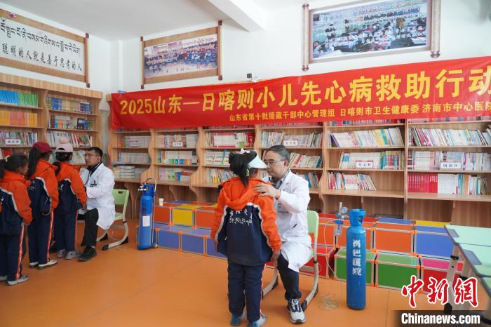 今年5月份,濟(jì)南市中心醫(yī)院心外科專家在日喀則市邊吸氧,邊為孩子們聽診。濟(jì)南市中心醫(yī)院供圖