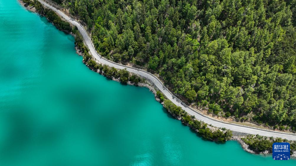 巴松措岸邊蜿蜒的公路(5月28日攝,無(wú)人機(jī)照片)。新華社記者 晉美多吉 攝