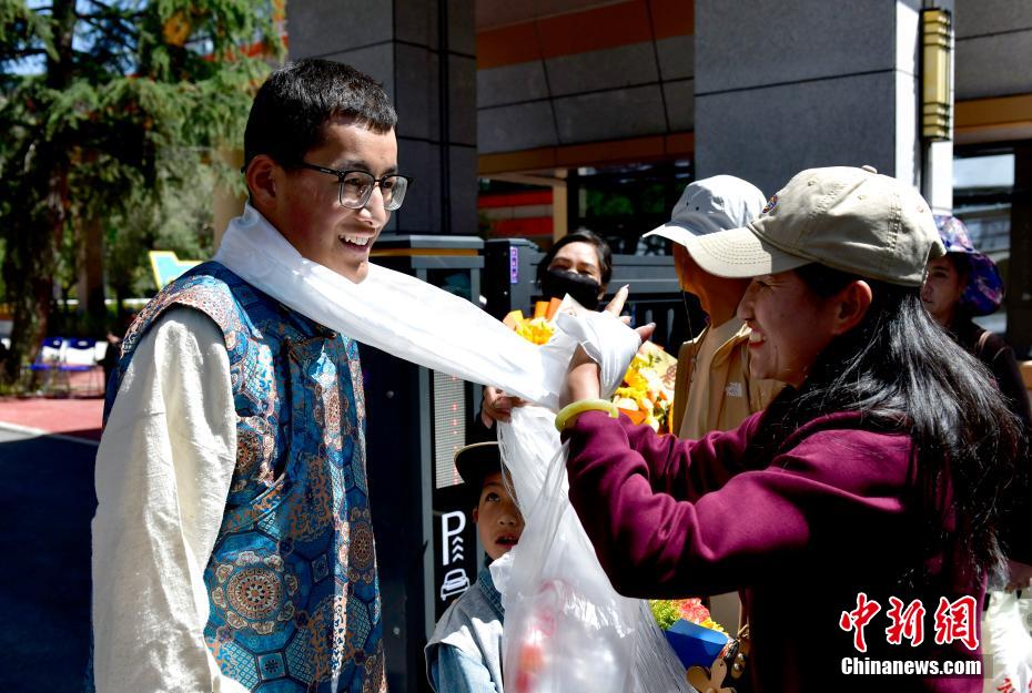 6月9日,西藏拉薩江蘇實(shí)驗(yàn)中學(xué)考點(diǎn)外親友為考生送上哈達(dá)。當(dāng)日,西藏自治區(qū)2025年普通高考完成所有科目考試,2025年西藏高考落下帷幕。中新社記者 貢嘎來松 攝