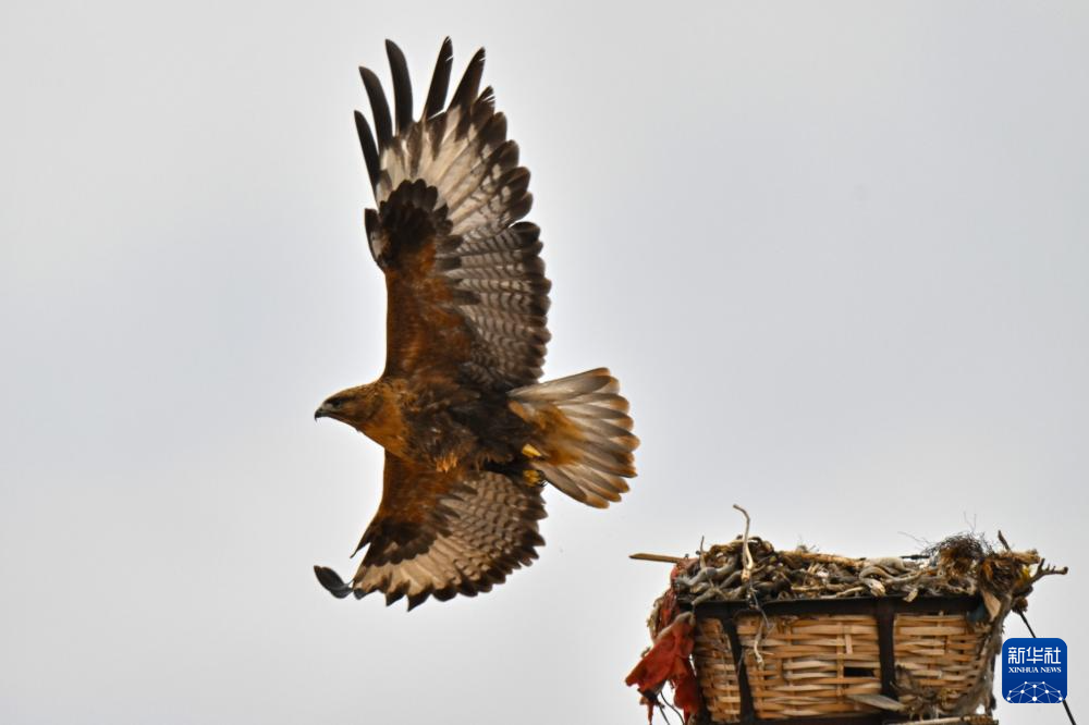 羌塘草原上的一只大鵟飛回鷹架上的巢(6月7日攝)。新華社記者 孫瑞博 攝
