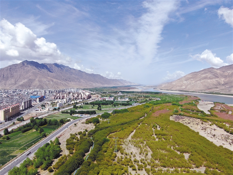 雅江中游“百里綠色生態(tài)長廊”與日新月異的山南市區(qū)和諧共生,展現(xiàn)出高原獨(dú)有的生態(tài)之美(無人機(jī)照片)。記者 武沛濤 攝