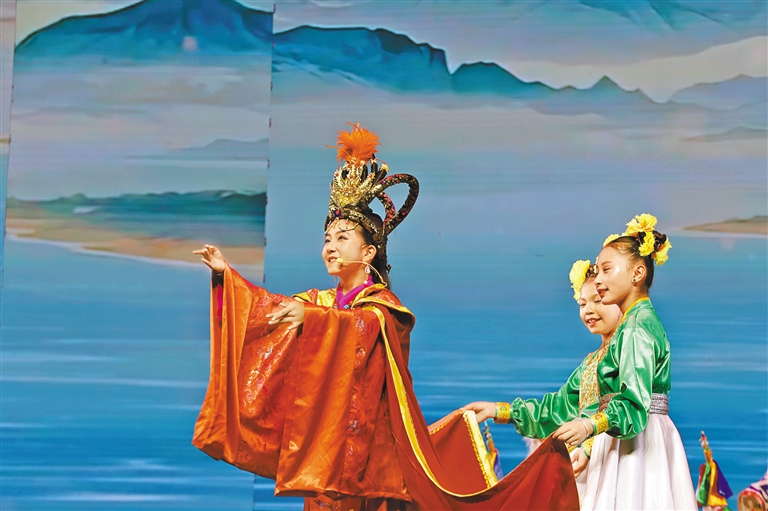 舞臺中央,12歲的其美卓嘎身著錦繡華服,以清亮唱腔和靈動演繹,將文成公主的溫婉堅毅展現(xiàn)得淋漓盡致?!爱斘掖┥蠎蚍?、唱起‘漢藏情誼潔如璧’時,仿佛真的穿越到千年前的和親之路?!毖莩鼋Y(jié)束后,小姑娘眼中閃爍著興奮的光芒,“原來民族團結(jié)的故事,就藏在這些古老而動人的戲文里?!逼涓赣H倫珠難掩自豪:“文成公主促進了漢藏交融,女兒能表演這個節(jié)目,用藏戲詮釋民族團結(jié),是我們?nèi)业尿湴?!?/p>