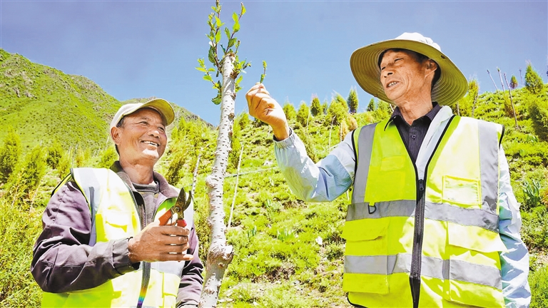 在2號片區(qū),一支特殊養(yǎng)護(hù)隊(duì)伍映入眼簾。十幾位藏族村民在技術(shù)員的指導(dǎo)下修剪枝條,掌握技術(shù)后將成為專業(yè)管護(hù)人員。村民的動(dòng)作略顯生疏,但專注的神情流露出對樹苗的珍視。