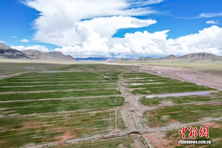 7月20日,航拍西藏阿里地區(qū)革吉縣文布當(dāng)桑鄉(xiāng)的人工種草基地。為解決當(dāng)?shù)囟旧笥貌堇щy,減輕天然草場壓力,2016年起文布當(dāng)桑鄉(xiāng)規(guī)劃建設(shè)人工種草基地。截至2024年,已種植人工草場3590畝,草業(yè)收入229.3萬元人民幣,有效帶動當(dāng)?shù)剞r(nóng)牧民就業(yè)創(chuàng)收和推動生態(tài)可持續(xù)發(fā)展。(無人機照片)中新社記者 張祥毅 攝