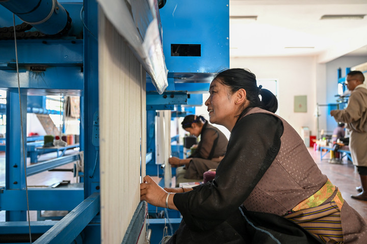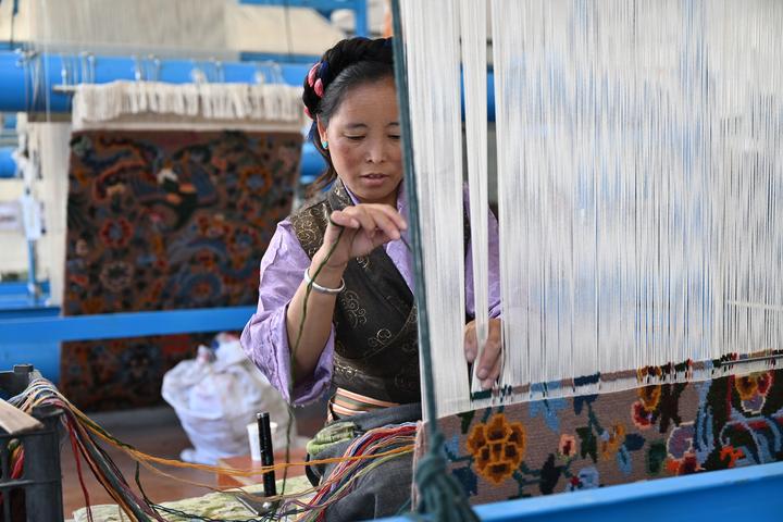 藏毯編織車(chē)間內(nèi),珍拉在編織藏毯。新華社記者 李鑫 攝