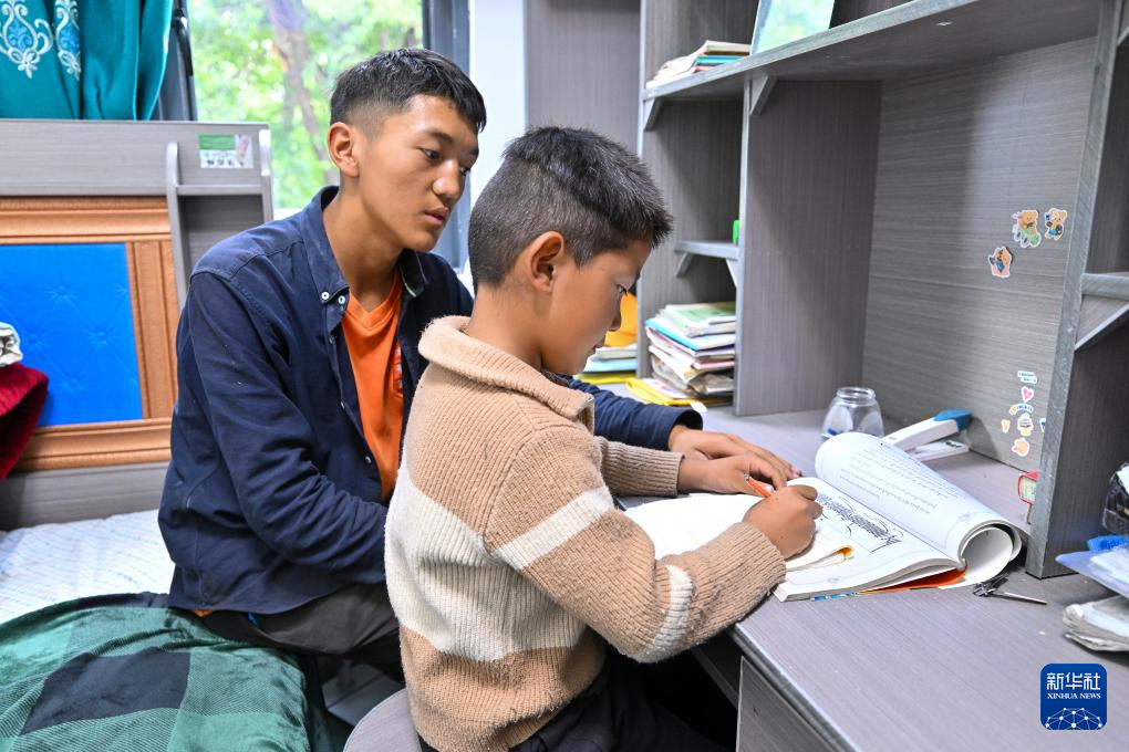 7月21日,17歲的米瑪次仁(左)在新房臥室內(nèi)輔導7歲的弟弟堅阿達瓦寫作業(yè)。新華社記者 李鑫 攝