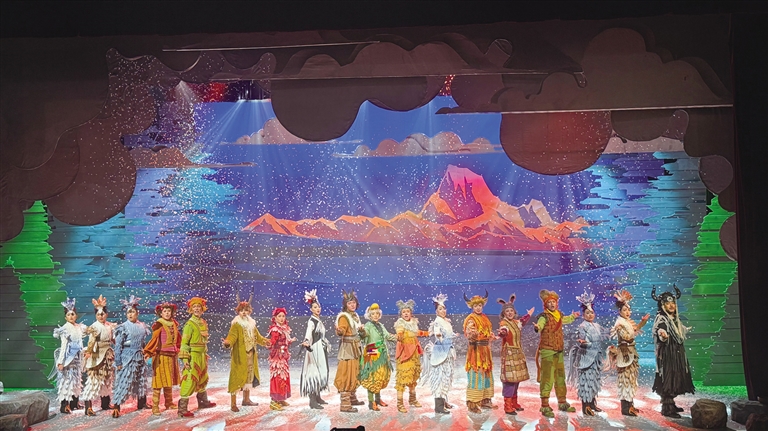 在《高原上的精靈》舞臺上,西藏傳統(tǒng)樂器的韻律與生態(tài)寓言相互交織。當弦子、鷹笛和扎念琴的聲音劃破夜空時,小觀眾們已沉浸其中。藏戲溫巴的藍面具在聚光燈下浮現(xiàn),藏戲特有的說唱調式如雪山融水般流淌……《高原上的精靈》以80分鐘的音樂劇形式突破傳統(tǒng)話劇的敘事框架,這種形式選擇源于深刻的兒童心理洞察——音樂劇特有的歌舞敘事能持續(xù)刺激視覺與聽覺神經,避免低齡觀眾對純對白場景產生倦怠感。
